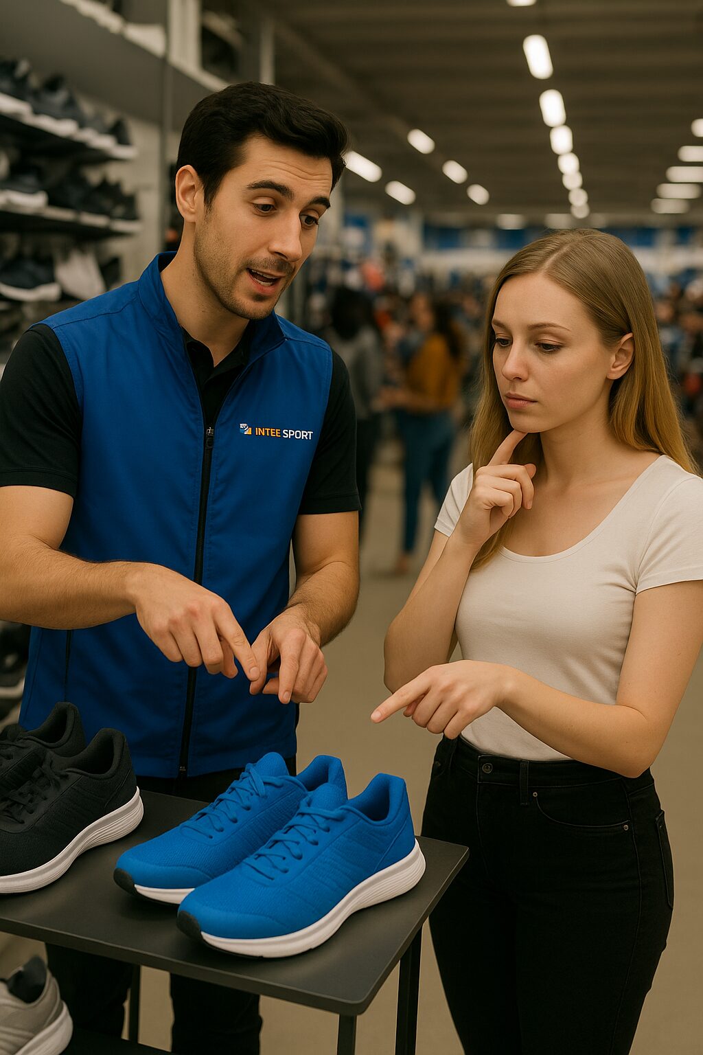 Contexte : Un alternant d’IFP’Alternance en poste dans un magasin de sport conseille une cliente intéressée par une paire de chaussures.